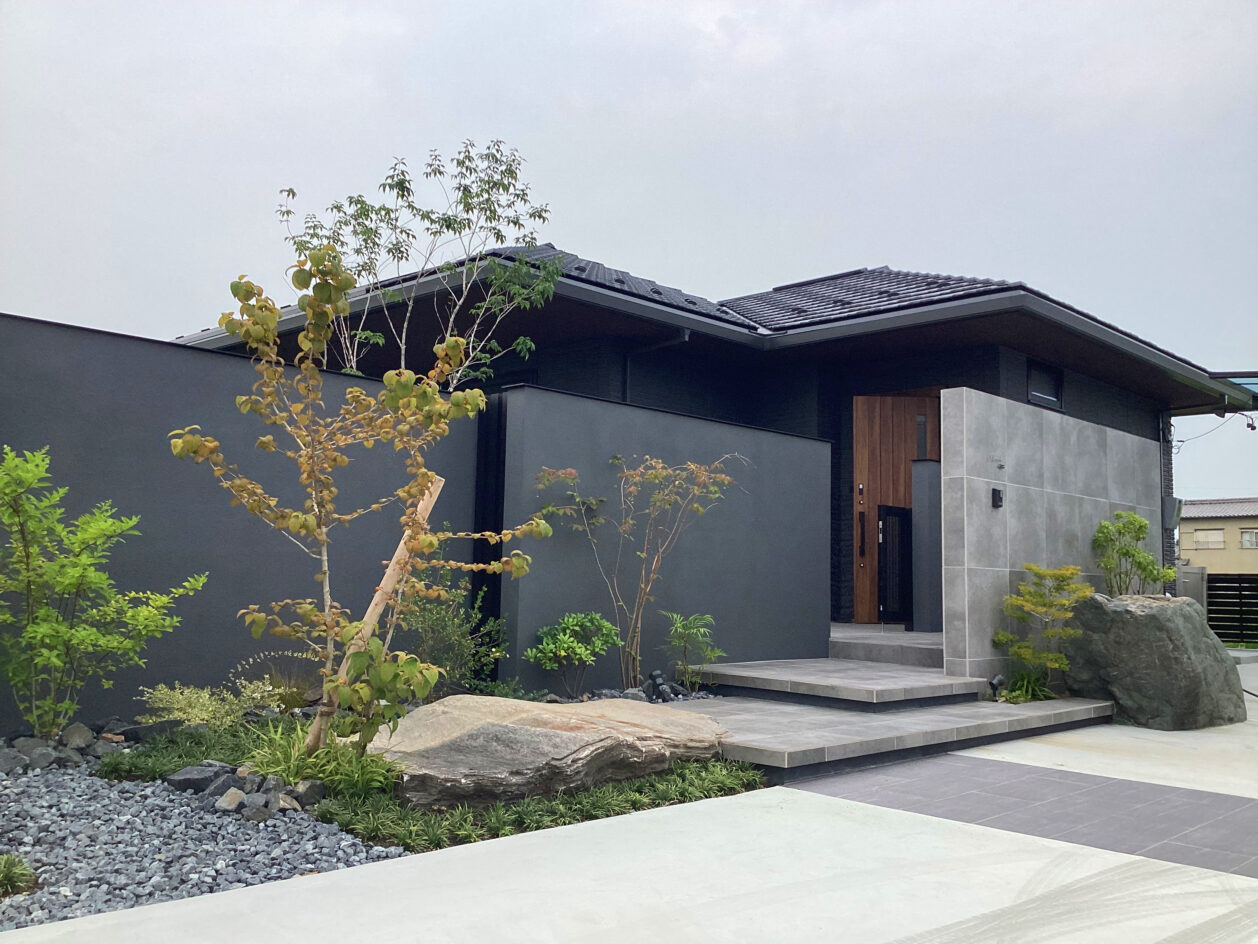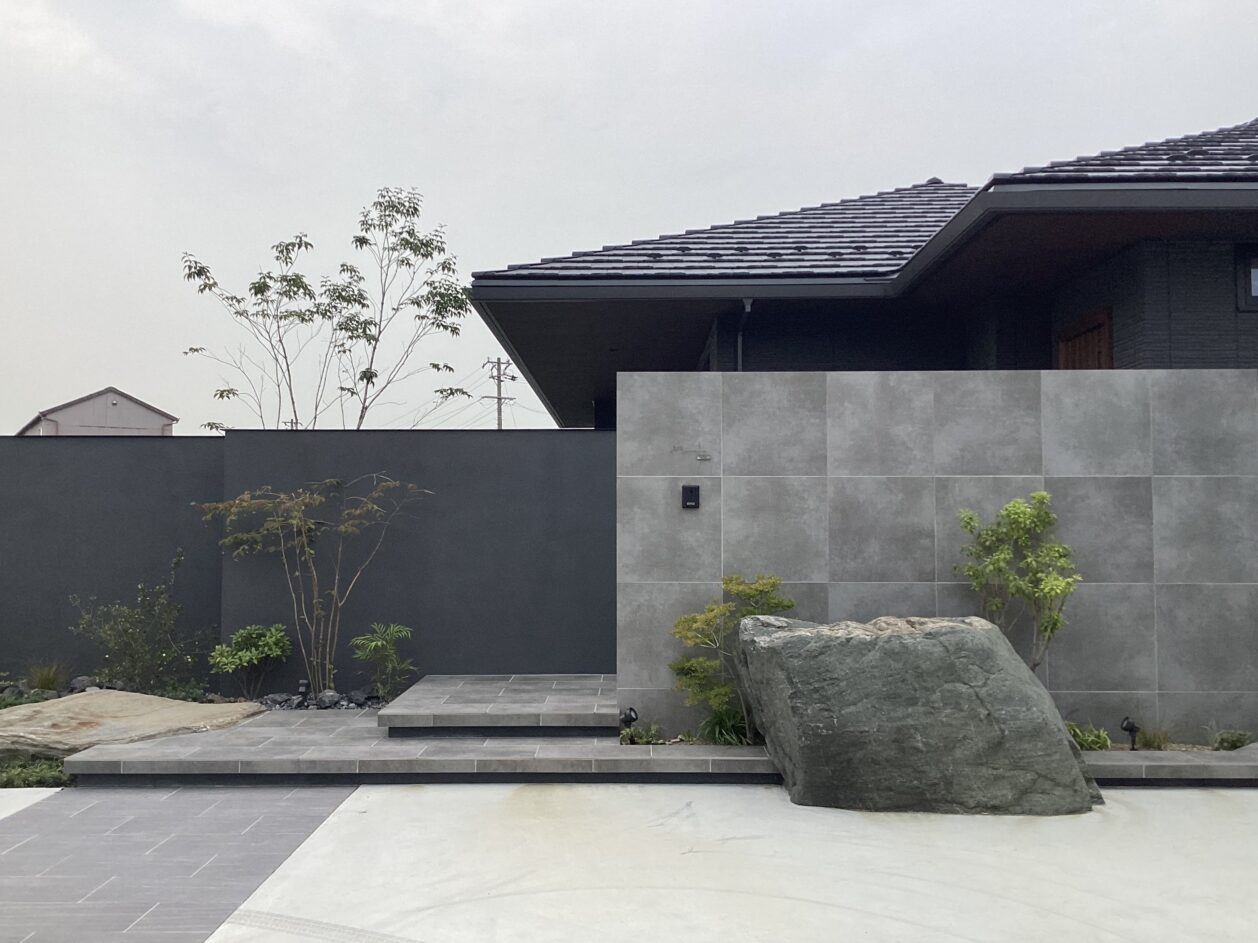 タイルや塗装でモダンな雰囲気に、石、植物をバランスよく配置して動きと重厚感」のある玄関先にしました。