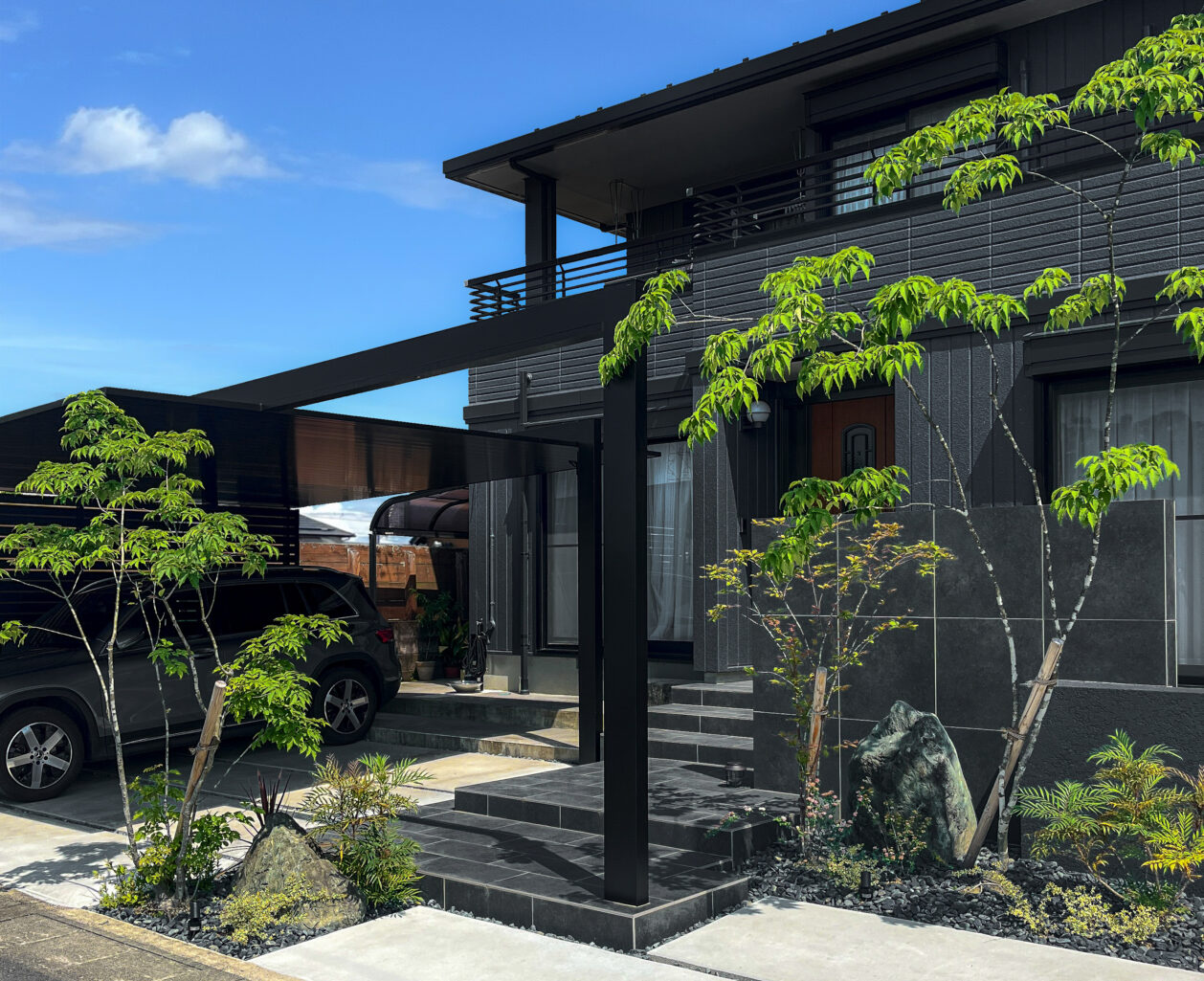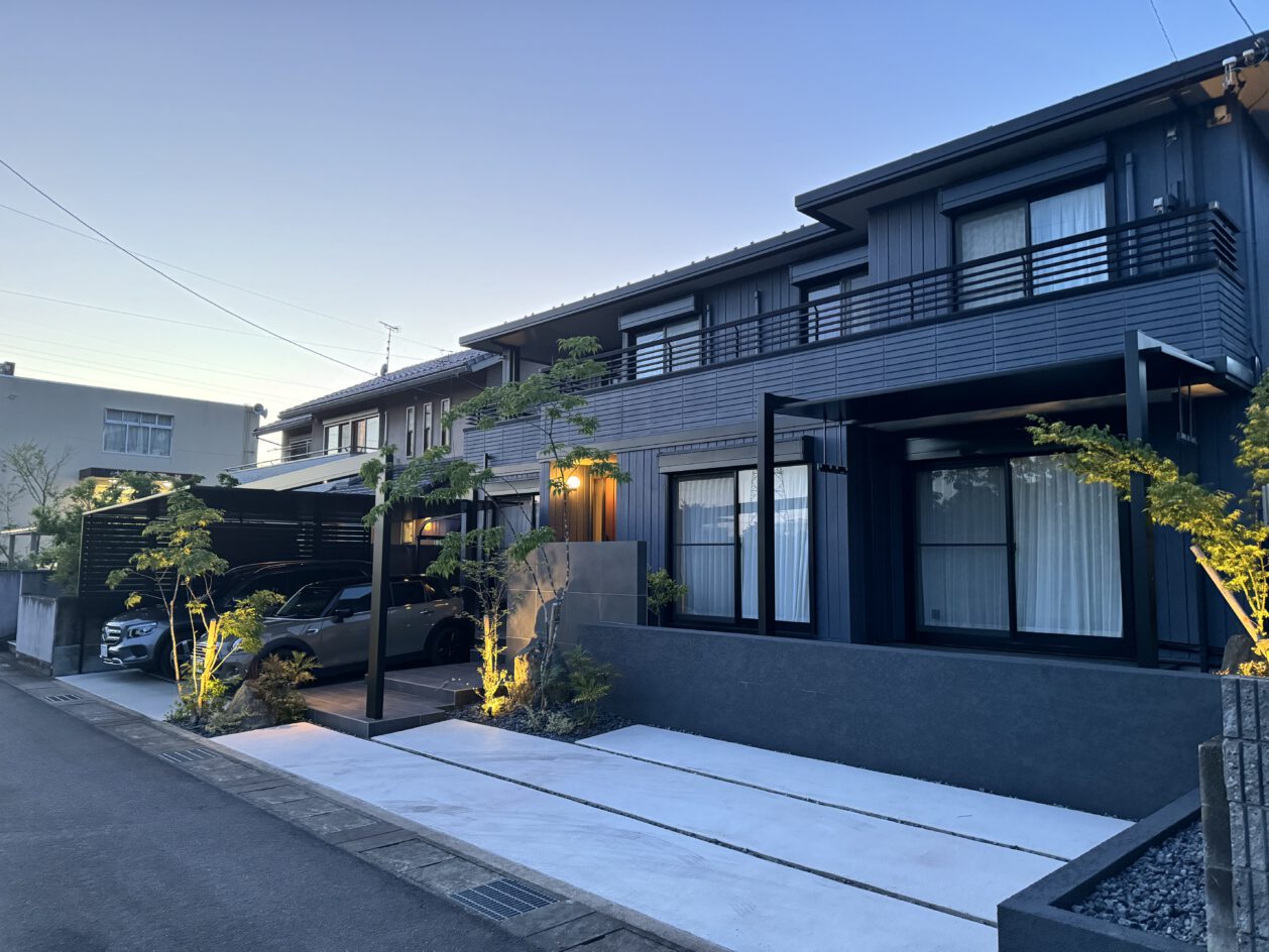 ダークトーンを基調に、植栽の柔らかさと灯りを重ねることで、重たさを感じさせない外構に仕上げています。