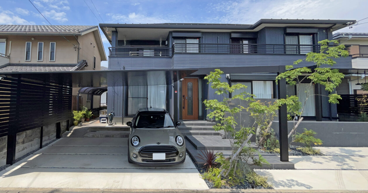 梁を延長したカーポートが、住まいに奥行きと象徴的な入口を与えます。